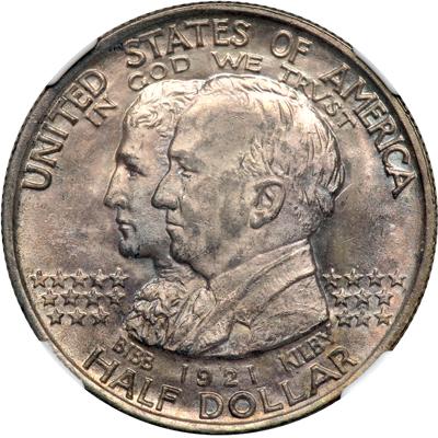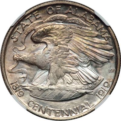 1921 Alabama Half Dollar, no 2 x 2. NGC graded MS-65. Nicely toned. A beauty! Llustrous and exceptionally attractive Gem that has exquisite fields and devices. Pop 30; 2 finer in 66. (PCGS # 9224).