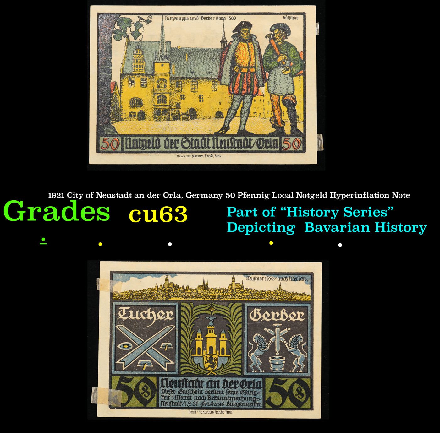 1921 City of Neustadt an der Orla, Germany 50 Pfennig Local Notgeld Hyperinflation Note Grades Select CU. Notgeld is German for "emergency/necessity money". Notgeld typically refers to German and Austrian notes produced in the post-WWI period. Somewhat similar to Depression Scrip in the USA, these notes were issued when there wasn'te nough state-produced money available from the central bank. Issuing institutions were often a town's savings banks, municipalities, or private or state-owned firms. Nearly all issues contained an expiry date, after which time they were invalid. Issues without dates ordinarily had an expiry announced in a newspaper or at the place of issuance.
