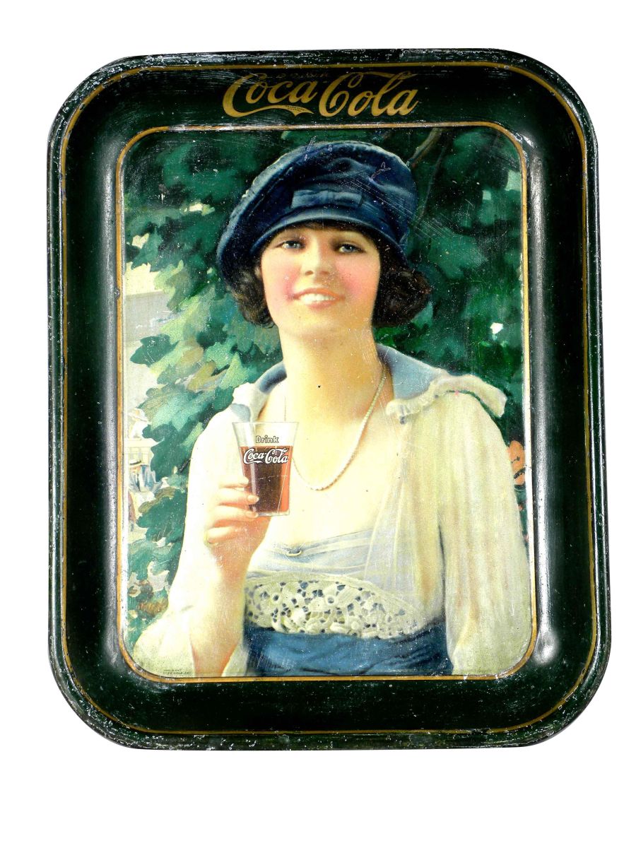 1921 Coca Cola Tin Serving Tray. Depicting woman in blue hat holding glass of coke. Edge ware and surface scratches throughout, fair condition. 10 1/2 X 13 1/4 inches.