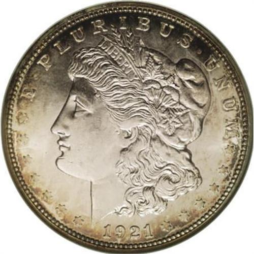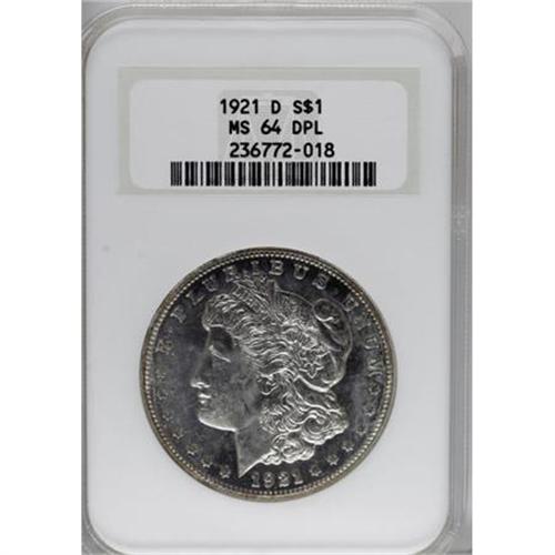 <B>1921-D $1 MS64 Deep Prooflike NGC.</B></I> Deeply mirrored surfaces are seldom seen on any 1921 Morgan dollar, regardless of its originating Mint. For example, NGC has certified 54 examples in MS64 DPL with eight finer pieces from Philadelphia, one MS64 DPL from San Francisco, with none finer, and just eight with one finer from Denver (7/07). They are all rare. Near-Gem surfaces are mostly brilliant with pleasing peripheral iridescence. Slight weakness over Liberty's ear and on the eagle's breast are typical for this otherwise sharply struck example.<BR><BR><b>Shipping:</b> Coins & Currency (<a target="_blank" href="http://www.heritageauctions.com/common/shipping.php">view shipping information</a>)