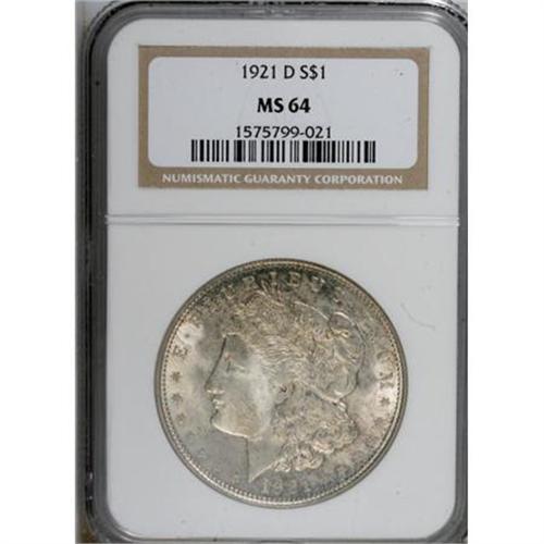 <B>1921-D $1 MS64 NGC.</B></I> NGC Census: (4018/1878). PCGS Population (3393/1353). Mintage: 20,345,000. Numismedia Wsl. Price for NGC/PCGS coin in MS64: $116. (#7298)<BR><BR><b>Shipping:</b> Coins & Currency (<a target="_blank" href="http://www.heritageauctions.com/common/shipping.php">view shipping information</a>)