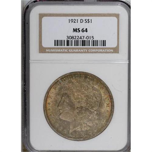 <B>1921-D $1 MS64 NGC.</B></I> NGC Census: (4018/1878). PCGS Population (3393/1351). Mintage: 20,345,000. Numismedia Wsl. Price for NGC/PCGS coin in MS64: $116. (#7298)<BR><BR><b>Shipping:</b> Coins & Currency (<a target="_blank" href="http://www.heritageauctions.com/common/shipping.php">view shipping information</a>)