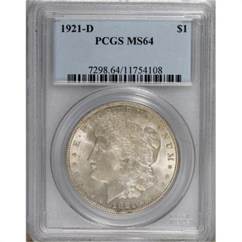 <B>1921-D $1 MS64 PCGS.</B></I> PCGS Population (3360/1326). NGC Census: (4008/1873). Mintage: 20,345,000. Numismedia Wsl. Price for NGC/PCGS coin in MS64: $116. (#7298)<BR><BR><b>Shipping:</b> Coins & Currency (<a target="_blank" href="http://www.heritageauctions.com/common/shipping.php">view shipping information</a>)