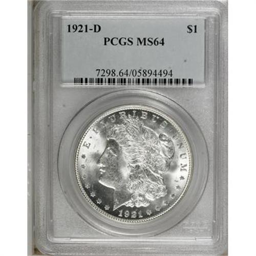 <B>1921-D $1 MS64 PCGS.</B></I> PCGS Population (3453/1395). NGC Census: (4138/1908). Mintage: 20,345,000. Numismedia Wsl. Price for NGC/PCGS coin in MS64: $116. (#7298)<BR><BR><b>Shipping:</b> Coins & Currency (<a target="_blank" href="http://www.heritageauctions.com/common/shipping.php">view shipping information</a>)