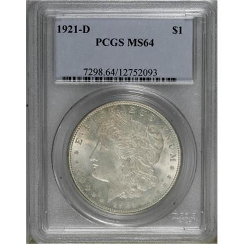 <B>1921-D $1 MS64 PCGS.</B></I> PCGS Population (3469/1406). NGC Census: (4193/1922). Mintage: 20,345,000. Numismedia Wsl. Price for NGC/PCGS coin in MS64: $116. (#7298)<BR><BR><b>Shipping:</b> Coins & Currency (<a target="_blank" href="http://www.heritageauctions.com/common/shipping.php">view shipping information</a>)