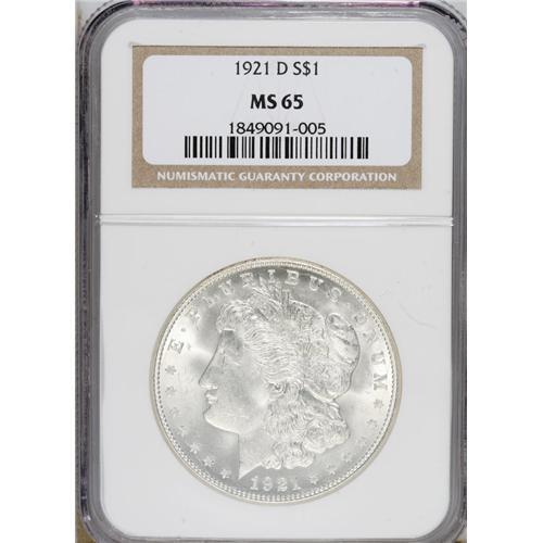 <B>1921-D $1 MS65 NGC.</B></I> NGC Census: (1626/211). PCGS Population (1136/182). Mintage: 20,345,000. Numismedia Wsl. Price: $256. (#7298)<BR><BR><b>Shipping:</b> Coins & Currency (<a target="_blank" href="http://www.heritageauctions.com/common/shipping.php">view shipping information</a>)