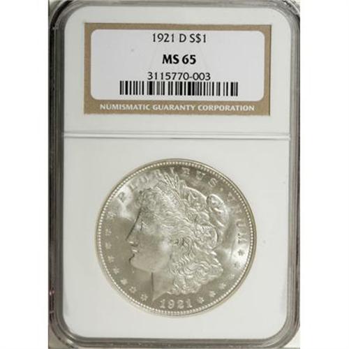 <B>1921-D $1 MS65 NGC.</B></I> NGC Census: (1656/222). PCGS Population (1176/182). Mintage: 20,345,000. Numismedia Wsl. Price for NGC/PCGS coin in MS65: $264. (#7298)<BR><BR><b>Shipping:</b> Coins & Currency (<a target="_blank" href="http://www.heritageauctions.com/common/shipping.php">view shipping information</a>)
