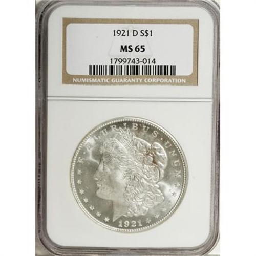 <B>1921-D $1 MS65 NGC.</B></I> NGC Census: (1656/222). PCGS Population (1176/182). Mintage: 20,345,000. Numismedia Wsl. Price for NGC/PCGS coin in MS65: $264. (#7298)<BR><BR><b>Shipping:</b> Coins & Currency (<a target="_blank" href="http://www.heritageauctions.com/common/shipping.php">view shipping information</a>)