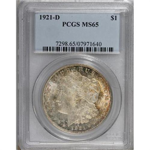 <B>1921-D $1 MS65 PCGS.</B></I> PCGS Population (1154/180). NGC Census: (1656/222). Mintage: 20,345,000. Numismedia Wsl. Price for NGC/PCGS coin in MS65: $264. (#7298)<BR><BR><b>Shipping:</b> Coins & Currency (<a target="_blank" href="http://www.heritageauctions.com/common/shipping.php">view shipping information</a>)