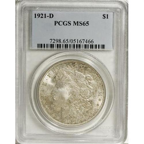 <B>1921-D $1 MS65 PCGS.</B></I> PCGS Population (1176/182). NGC Census: (1656/222). Mintage: 20,345,000. Numismedia Wsl. Price for NGC/PCGS coin in MS65: $264. (#7298)<BR><BR><b>Shipping:</b> Coins & Currency (<a target="_blank" href="http://www.heritageauctions.com/common/shipping.php">view shipping information</a>)