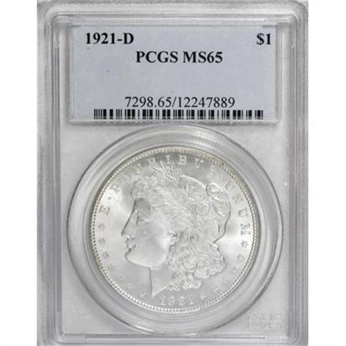 <B>1921-D $1 MS65 PCGS.</B></I> . PCGS Population (1202/183). NGC Census: (1683/225). Mintage: 20,345,000. Numismedia Wsl. Price for NGC/PCGS coin in MS65: $260. (#7298)<BR><BR><b>Shipping:</b> Coins & Currency (<a target="_blank" href="http://www.heritageauctions.com/common/shipping.php">view shipping information</a>)