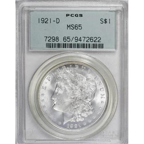 <B>1921-D $1 MS65 PCGS.</B></I> . PCGS Population (1202/183). NGC Census: (1683/225). Mintage: 20,345,000. Numismedia Wsl. Price for NGC/PCGS coin in MS65: $260. (#7298)<BR><BR><b>Shipping:</b> Coins & Currency (<a target="_blank" href="http://www.heritageauctions.com/common/shipping.php">view shipping information</a>)
