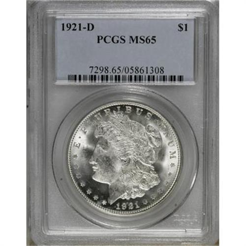 <B>1921-D $1 MS65 PCGS.</B></I> PCGS Population (1219/187). NGC Census: (1696/226). Mintage: 20,345,000. Numismedia Wsl. Price for NGC/PCGS coin in MS65: $260. (#7298)<BR><BR><b>Shipping:</b> Coins & Currency (<a target="_blank" href="http://www.heritageauctions.com/common/shipping.php">view shipping information</a>)