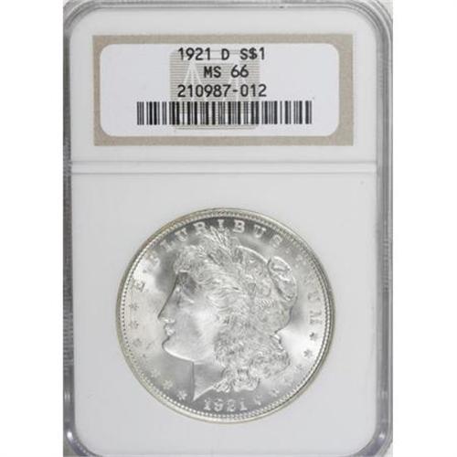 <B>1921-D $1 MS66 NGC.</B></I> The first silver dollar issue struck at Denver, the 1921-D Morgan dollar had a production of over 20 million pieces, though finding anything finer than a Gem can prove time-consuming. This boldly struck, slightly hazy example displays a number of die cracks at the reverse periphery. Predominantly frosty, though a few vertical streaks of brilliance are noted behind the eagle. NGC has certified just six coins finer (5/07).<BR><I>From The Silver Fox Collection.</B></I><BR><BR><b>Shipping:</b> Coins & Currency (<a target="_blank" href="http://www.heritageauctions.com/common/shipping.php">view shipping information</a>)