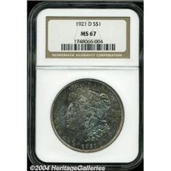 <table><tbody><tr><td><table> <TR><TD width="100%"><TABLE cellSpacing=1 cellPadding=3 width="100%" border=0><TBODY><TR><TD width="100%" bgColor=#79735c><FONT face=arial color=#ffffff size=3><B>Description</B> </FONT></TD></TR><TR><TD width="100%" bgColor=#ffffff><FONT face=arial size=2><B>1921-D $1 MS67 NGC.</B></I> This high mintage issue should be plentifully available in all Uncirculated grades. However, the 1921-D was a widely circulated issue, and when found in mint condition, it usually shows numerous abrasions. This piece is exceptionally clean with bright mint frost that has taken on a somewhat mottled coating of turquoise-blue and antique-golden color over each side. Sharply struck also with slight weakness seen on a couple of the leaves on the wreath. One of only four pieces to have been so graded by NGC with one finer (11/03). </FONT></TD></TR></TBODY></TABLE></TD></TR></TBODY></TABLE><BR><A name=PricesRealized></A><TABLE cellSpacing=0 cellPadding=0 width="100%" bgColor=#000000 border=0><TBODY><TR><TD width="100%"><TABLE cellSpacing=1 cellPadding=3 width="100%" border=0><TBODY><TR><TD width="100%" bgColor=#79735c><A name=PR><FONT face=arial color=#ffffff size=3><B>Previous Prices from Heritage Auctions</B> </FONT></A></TD></TR><TR><TD bgColor=#f6f6ed><TABLE cellSpacing=0 cellPadding=0 width="100%" border=1><TBODY><TR><TD align=middle width="33%"><B>Date</B></TD><TD align=middle width="33%"><B>Service</B></TD><TD align=middle width="33%"><B>Price</B></TD></TR><TR bgColor=whitesmoke><TD width="33%"><B>05/31/2003</B></TD><TD width="33%">NGC</TD><TD width="33%">$4,025.00</TD></TR><TR bgColor=whitesmoke><TD width="33%"><B>01/05/2001</B></TD><TD width="33%">PCGS</TD><TD width="33%">$6,325.00</TD></TR><TR bgColor=whitesmoke><TD width="33%"><B>08/09/2000</B></TD><TD width="33%">PCGS</TD><TD width="33%">$10,925.00</TD></TR></TBODY></TABLE></TD></TR><TR><TD bgColor=#ffffff><FONT face=arial size=1 ?>PLEASE NOTE: All prices realized reflect the final hammer price PLUS the buyer's premium in auctions that charge a buyer's premium. Each item has a notation at the top of the listing indicating whether that lot included a buyer's premium. Example: A item that sells with a final hammer price of $100 and a 20% buyer's premium will display with a price realized of $120. All information listed is intended to be as accurate as possible, but errors are possible. Please use this guide carefully and inform us of any inaccuracies. </FONT></TD></TR></TBODY></TABLE></TD></TR></TBODY></TABLE><BR><TABLE cellSpacing=0 cellPadding=0 width="100%" bgColor=#000000 border=0><TBODY><TR><TD width="100%"><TABLE cellSpacing=1 cellPadding=3 width="100%" border=0><TBODY><TR><TD width="100%" bgColor=#79735c colSpan=6><FONT face=arial color=#ffffff size=3><B>Price Guide*</B> </FONT></TD></TR><TR bgColor=#f6f6ed><TD align=middle><B>Grade</B> </TD><TD align=middle><B>Coin World<BR>(Trends)</B> </TD><TD align=middle><B>Numismedia<BR>Retail</B> </TD><TD align=middle><B>Numismedia<BR>Wholesale</B> </TD><TD align=middle><B>Coin<BR>Universe</B> </TD><TD align=middle><B>Heritage<BR>Value Index</B> </TD></TR><TR bgColor=#ffffff><TD align=middle>66</TD><TD align=right>$1,325.00</TD><TD align=right>---</TD><TD align=right>$1,050.00</TD><TD align=right>$1,100.00</TD><TD align=right>$773.75</TD></TR><TR style="FONT-WEIGHT: bold" bgColor=#cccfdd><TD align=middle>67</TD><TD align=right>---</TD><TD align=right>---</TD><TD align=right>$7,750.00</TD><TD align=right>$12,500.00</TD><TD align=right>$6,700.00</TD></TR><TR bgColor=#ffffff><TD align=middle>68</TD><TD align=right>---</TD><TD align=right>---</TD><TD align=right>---</TD><TD align=right>---</TD><TD align=right>---</TD></TR><TR bgColor=#ffffff><TD colSpan=6><FONT size=1>*All information listed is intended to be as accurate as possible, but errors are possible. No item may be returned or refused based on this information which is provided as a service to our customers. You should contact each pricing source directly to determine the accuracy of this information. </FONT></TD></TR></TBODY></TABLE></TD></TR></TBODY></TABLE><BR><TABLE cellSpacing=0 cellPadding=0 width="100%" bgColor=#000000 border=0><TBODY><TR><TD width="100%"><TABLE cellSpacing=1 cellPadding=3 width="100%" border=0><TBODY><TR><TD width="100%" bgColor=#79735c><FONT face=arial color=#ffffff size=3><B>Population Guide</B> </FONT></TD></TR><TR bgColor=#ffffff><TD align=middle><!-- Begin Output of Population Grid--><TABLE cellSpacing=0 cellPadding=0 width="100%" border=0><TBODY><TR><TD vAlign=center><TABLE cellSpacing=0 width="100%" border=1 cellsadding="3"><TBODY><TR><TD vAlign=center><TABLE cellSpacing=0 cellPadding=3 width="100%" border=1><TBODY><TR><TD vAlign=center align=middle bgColor=#f0f1e8 colSpan=2 <CENTER><FONT face=Arial size=2><B>PCGS Pop </B></FONT><CENTER></CENTER></TD><TD vAlign=center align=middle bgColor=#f0f1e8 colSpan=2><CENTER><FONT face=Arial size=2><B>NGC Pop</B></CENTER></FONT></TD></TR><TR><TD vAlign=center><FONT face=Arial size=2>(67)</FONT> </TD><TD vAlign=center align=right><FONT face=Arial size=2>5</FONT> </TD><TD vAlign=center><FONT face=Arial size=2>(67)</FONT> </TD><TD vAlign=center align=right><FONT face=Arial size=2>4</FONT> </TD></TR><TR><TD vAlign=center><FONT face=Arial size=2>(>67)</FONT> </TD><TD vAlign=center align=right><FONT face=Arial size=2>0</FONT> </TD><TD vAlign=center><FONT face=Arial size=2>(>67)</FONT> </TD><TD vAlign=center align=right><FONT face=Arial size=2>1</FONT> </TD></TR></TBODY></TABLE></TD></TR></TBODY></TABLE></TD></TR></TBODY></TABLE><!-- End Output of Population Grid--></TD></TR></TBODY></TABLE></TD></TR></TBODY></TABLE><BR><TABLE cellSpacing=0 cellPadding=0 width="100%" bgColor=#000000 border=0><TBODY><TR> <font color='#000000'><span style='background-color: #FFFFFF'><td bgcolor='#FFFFFE'> Important notice: Heritage usually auctions material at the rate of 200-250 lots per hour. On some occasions eBay Live bid software or the Internet may not be able to keep u