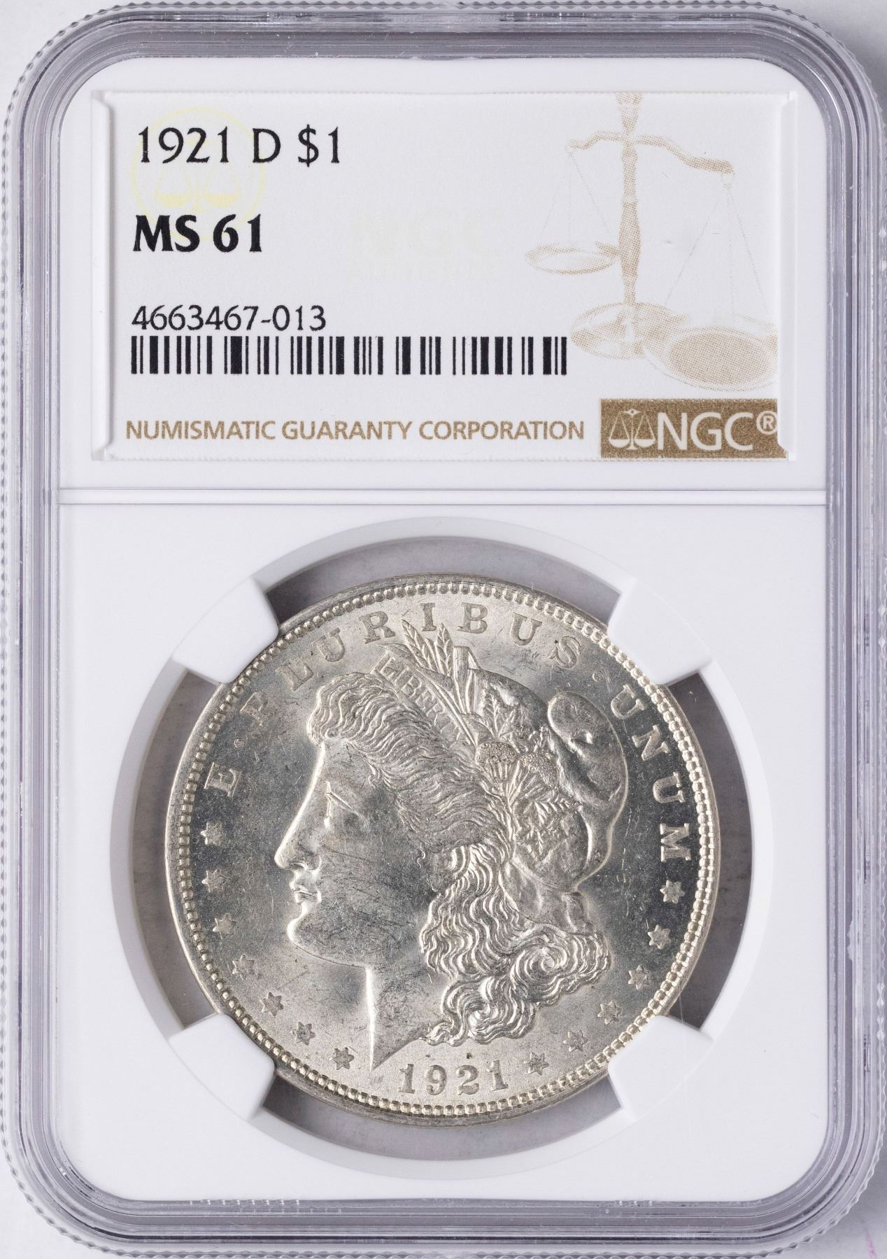 One 1921-D $1 Morgan Silver Dollar Coin NGC MS61.