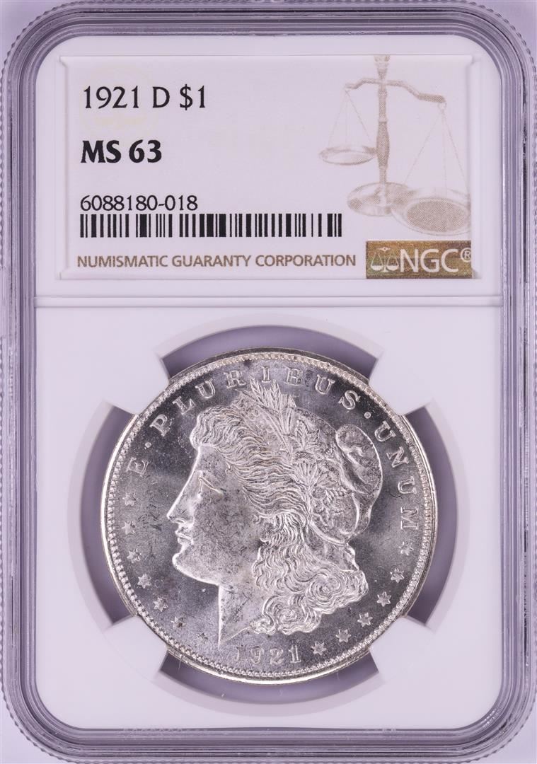 One 1921-D $1 Morgan Silver Dollar Coin NGC MS63. NGC Certified.