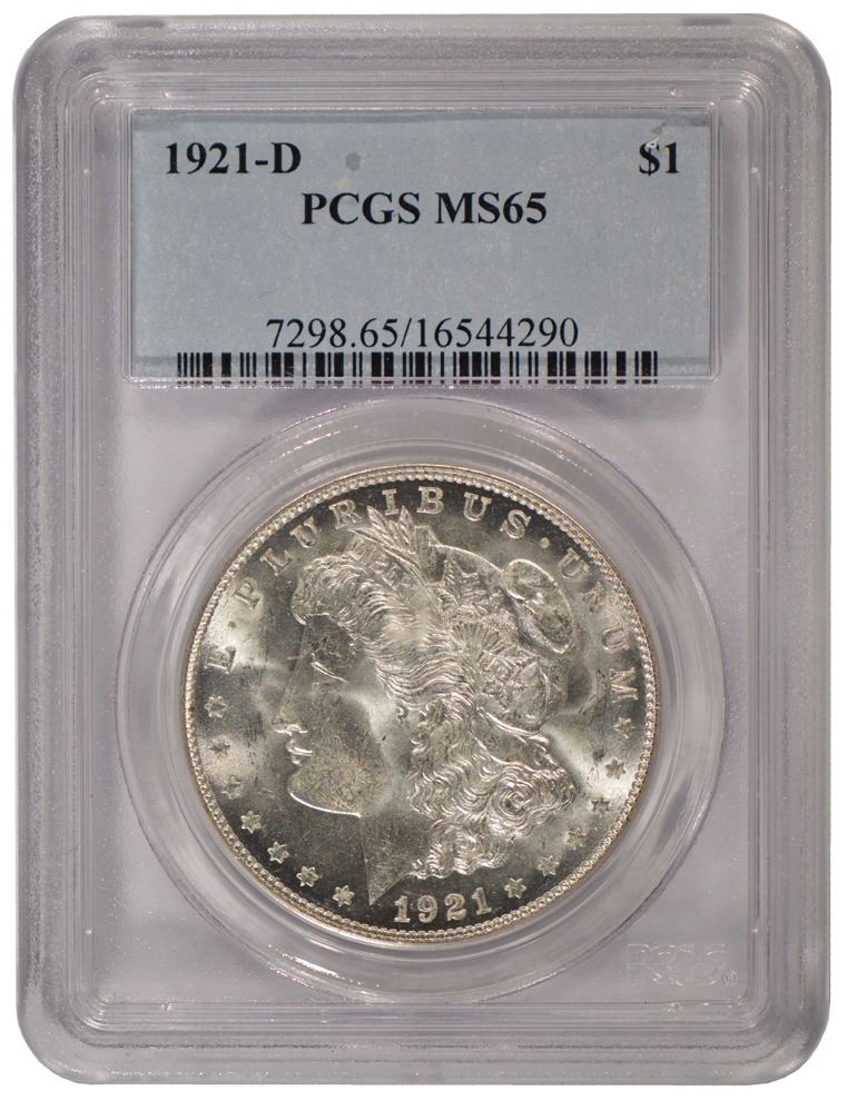 One 1921-D $1 Morgan Silver Dollar Coin PCGS MS65.