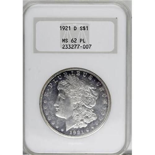 <B>1921-D $1 MS62 Prooflike NGC.</B></I> NGC Census: (34/138). PCGS Population (3/25). Numismedia Wsl. Price for NGC/PCGS coin in MS62: $121. (#7299)<BR><BR><b>Shipping:</b> Coins & Currency (<a target="_blank" href="http://www.heritageauctions.com/common/shipping.php">view shipping information</a>)