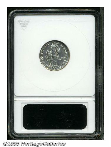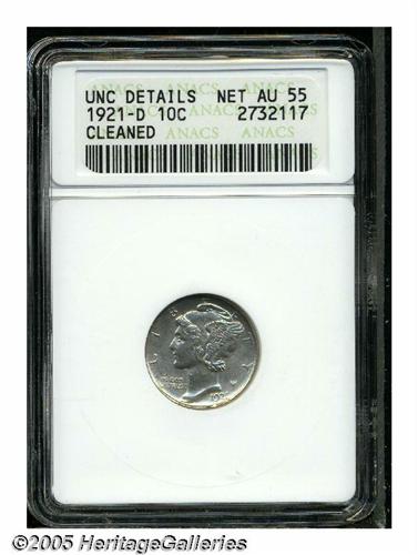 <B>1921-D<10C>--Cleaned--ANACS. Unc Details, Net AU55.</B></I> A lightly toned rare date Mercury Dime with ample shimmering luster. Wispy hairlines accompany the fields. An interesting mint-made lamination affects the E in ONE.