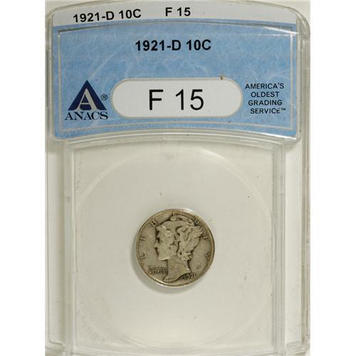 <B>1921-D 10C F15 ANACS.</B></I> NGC Census: (35/352). PCGS Population (45/335). Mintage: 1,080,000. Numismedia Wsl. Price: $203. (#4936)<BR><BR><b>Shipping:</b> Coins & Currency (<a target="_blank" href="http://www.heritageauctions.com/common/shipping.php">view shipping information</a>)