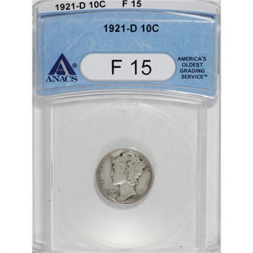 <B>1921-D 10C F15 ANACS.</B></I> NGC Census: (18/247). PCGS Population (46/357). Mintage: 1,080,000. Numismedia Wsl. Price for NGC/PCGS coin in F15: $217. (#4936)<BR><BR><B>Coin Engraver:</B> Adolph A. Weinman<BR><BR><b>Shipping:</b> Coins & Currency (<a target="_blank" href="http://www.heritageauctions.com/common/shipping.php">view shipping information</a>)