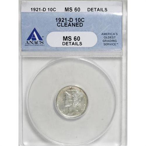 <B>1921-D 10C --Cleaned--ANACS. MS60 Details.</B></I> This low mintage Mercury dime is surprisingly free from contact, but the luster is slightly diminished. Still an impressive, well struck example that would not look out of place within an Uncirculated set.<BR><BR><B>Coin Engraver:</B> Adolph A. Weinman<BR><BR><b>Shipping:</b> Coins & Currency (<a target="_blank" href="http://www.heritageauctions.com/common/shipping.php">view shipping information</a>)