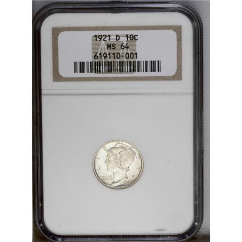 <B>1921-D 10C MS64 NGC.</B></I> The all-important bands are almost, but not quite, fully split. A lustrous and lightly toned near-Gem, refreshingly void of contact.
