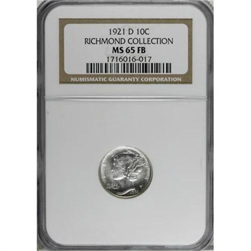 <B>1921-D 10C MS65 Full Bands NGC.</B></I> Ex: Richmond Collection. This stone-white Gem has dazzling luster and a pristine appearance. Generally well struck, with slight incompleteness on the tops of the CA in AMERICA and the base of the 21 in the date. The central bands are separated. Other than the better-known 1916-D, the 1921-D has the lowest mintage of the series. The Richmond Collection was a remarkably extensive holding dispersed in 2004.<BR><BR><B>Coin Engraver:</B> Adolph A. Weinman<BR><BR><b>Shipping:</b> Coins & Currency (<a target="_blank" href="http://www.heritageauctions.com/common/shipping.php">view shipping information</a>)