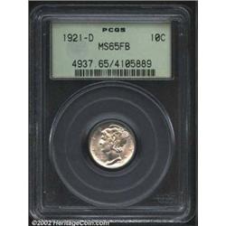 1921-D 10C MS65 Full Bands PCGS. Blazing white mint frost with near-flawless definition. The fields are virtually mark-free, but Mercury's neck displays a tiny mark that evidently prevents a higher grade. The scarcer of the two popular, key date issues and a striking coin that literally begs for MS66 consideration. Important notice: We expect to be auctioning lots at the rate of 200-250 per hour. Sometimes eBay Premier live bid software cannot keep up with that pace, so we strongly recommend that you place a realistic proxy bid now as insurance to avoid disappointment. Also please note that all Heritage/CAA lots purchased through eBay Premier carry a 20% Buyer's Premium.