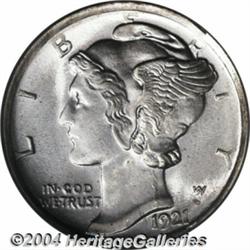 <B>1921-D<10C> MS65 Full Bands PCGS.</B></I> Nearly untoned, with just a hint of color on the reverse. Well struck in the centers, but somewhat soft at the peripheries, as is characteristic with this elusive date. One of the more popular dates in the Mercury dime series. Population: 45 in 65, 15 finer (7/04).<BR><I>From The Reed Hawn Collection of Mercury Dimes.</B></I> <BR><BR><B>Important notice:</B> Heritage usually auctions material at the rate of 200-250 lots per hour. On some occasions eBay Live bid software or the Internet may not be able to keep up with the pace of the auction. We recommend placing a realistic absentee bid now as insurance to avoid disappointment. Occasionally the auctioneer may eliminate or reject an eBay Live bid, and the auctioneer may also reopen a lot after the close of the eBay live bidding (usually because we missed an audience bid), and may reject your bid even if it shows you as the winning bidder. By bidding via eBay Live, you agree that Heritage may award the lot to another bidder at its sole discretion under the circumstances described above or any other reasonable circumstances. Since eBay bids are not shown to us until we open the lot on the floor, we treat those bids just like floor bids. In most cases the floor responds before the eBay bid is presented to us, due to Internet lag time, so for consistency we have made it a policy that floor bids are always considered first over tie eBay live bids. Also please note that all Heritage lots purchased through eBay Live carry a 20% Buyer's Premium. Please make sure you read the Terms and Conditions before you bid. </span></font></tr></table></td></tr></table>