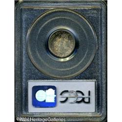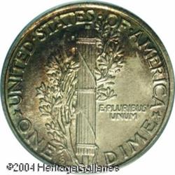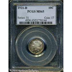 1921-D 10C MS65 PCGS. The 1921-D has an impressive <B>1921-D 10C MS65 PCGS.</B></I> The 1921-D has an impressively low mintage of only 1.08 million pieces, ranking it behind only the 1916-D in terms of overall rarity among Mercury Dimes. Gems are very scarce. This issue is notorious for weak peripheries. The present example is an exception, as the lettering on both sides is strong, the 1 in the date and the W in WE are full and completely separated from the rim, and the mintmark is strong. The middle bands on the fasces are essentially separated, though the separation is not deep. The surfaces on this coin are highly lustrous and exceptionally smooth. Each side possesses multicolored orange, green, gold, gray, and violet toning. An exceptionally attractive example of this rare, key issue. Population: 12 in 65, 10 finer (11/04). <BR><BR><B>Important notice:</B> Heritage usually auctions material at the rate of 200-250 lots per hour. On some occasions eBay Live bid software or the Internet may not be able to keep up with the pace of the auction. We recommend placing a realistic absentee bid now as insurance to avoid disappointment. Occasionally the auctioneer may eliminate or reject an eBay Live bid, and the auctioneer may also reopen a lot after the close of the eBay live bidding (usually because we missed an audience bid), and may reject your bid even if it shows you as the winning bidder. By bidding via eBay Live, you agree that Heritage may award the lot to another bidder at its sole discretion under the circumstances described above or any other reasonable circumstances. Since eBay bids are not shown to us until we open the lot on the floor, we treat those bids just like floor bids. In most cases the floor responds before the eBay bid is presented to us, due to Internet lag time, so for consistency we have made it a policy that floor bids are always considered first over tie eBay live bids. Also please note that all Heritage lots purchased through eBay Live carry a 20% Buyer's Premium. Please make sure you read the Terms and Conditions before you bid. This lot is being auctioned in conjunction with a live floor auction by Heritage Galleries & Auctioneers. All final auction and invoice information will be supplied by Heritage Galleries & Auctioneers, and all other information should be considered preliminary. Lot:5803