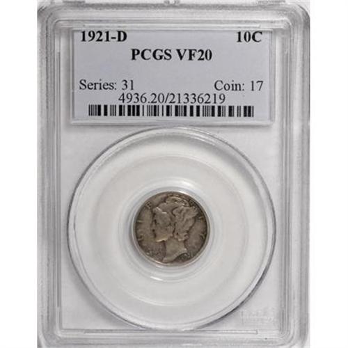 <B>1921-D 10C VF20 PCGS.</B></I> PCGS Population (43/329). NGC Census: (13/238). Mintage: 1,080,000. Numismedia Wsl. Price for NGC/PCGS coin in VF20: $310. (#4936)<BR><BR><B>Coin Engraver:</B> Adolph A. Weinman<BR><BR><b>Shipping:</b> Coins & Currency (<a target="_blank" href="http://www.heritageauctions.com/common/shipping.php">view shipping information</a>)