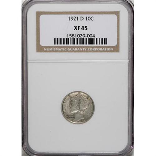 <B>1921-D 10C XF45 NGC.</B></I> Luminous and lightly circulated, this well struck semi-key has silver-blue and golden-tan toning over each side. An attractive, affordable Choice XF example, this piece is one of under 1.1 million coins minted.<BR><BR><B>Coin Engraver:</B> Adolph A. Weinman<BR><BR><b>Shipping:</b> Coins & Currency (<a target="_blank" href="http://www.heritageauctions.com/common/shipping.php">view shipping information</a>)
