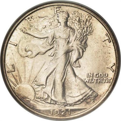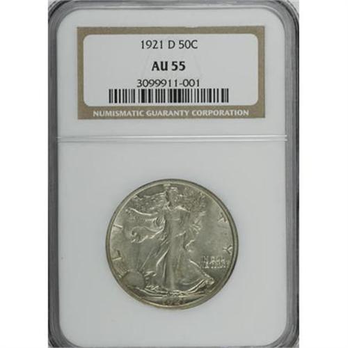 <B>1921-D 50C AU55 NGC.</B></I> Just a bit of light rub on the high points, visible as a slight color change, separates this key-date piece from Mint State, but the fields are frosty silver, kissed with gold, and most of the mint luster remains. This piece would fit nicely into a Mint State set at a fraction of the price.<BR><BR><B>Coin Engraver:</B> Adolph A. Weinman<BR><BR><b>Shipping:</b> Coins & Currency (<a target="_blank" href="http://www.heritageauctions.com/common/shipping.php">view shipping information</a>)