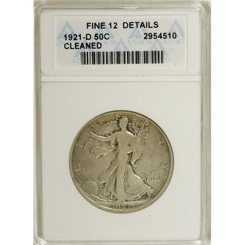<B>1921-D 50C --Cleaned--ANACS. Fine 12 Details.</B></I> NGC Census: (39/310). PCGS Population (43/343). Mintage: 208,000. Numismedia Wsl. Price: $354. (#6584)<BR><BR><b>Shipping:</b> Coins & Currency (<a target="_blank" href="http://www.heritageauctions.com/common/shipping.php">view shipping information</a>)