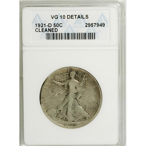 <B>1921-D 50C --Cleaned--ANACS. VG10 Details.</B></I> NGC Census: (88/349). PCGS Population (79/386). Mintage: 208,000. Numismedia Wsl. Price: $279. (#6584)<BR><BR><b>Shipping:</b> Coins & Currency (<a target="_blank" href="http://www.heritageauctions.com/common/shipping.php">view shipping information</a>)