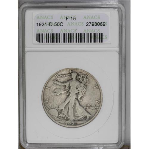 <B>1921-D 50C Fine 15 ANACS.</B></I> One of the keys to the Walking Liberty set, the '21-D has the lowest mintage of the series, a mere 208,000 pieces. This example has light gray patina, with some darker highlights near the devices, and reveals no marks of any consequence.