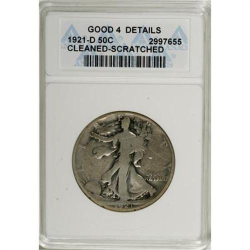 <B>1921-D 50C --Cleaned, Scratched--ANACS. Good 4 Details.</B></I> NGC Census: (25/399). PCGS Population (51/668). Mintage: 208,000. Numismedia Wsl. Price for NGC/PCGS coin in G4 : $222. (#6584)<BR><BR><B>Coin Engraver:</B> Adolph A. Weinman<BR><BR><b>Shipping:</b> Coins & Currency (<a target="_blank" href="http://www.heritageauctions.com/common/shipping.php">view shipping information</a>)