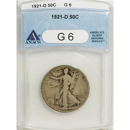 <B>1921-D 50C G6 ANACS.</B></I> NGC Census: (42/356). PCGS Population (80/583). Mintage: 208,000. Numismedia Wsl. Price for NGC/PCGS coin in G6 : $237. (#6584)<BR><BR><B>Coin Engraver:</B> Adolph A. Weinman<BR><BR><b>Shipping:</b> Coins & Currency (<a target="_blank" href="http://www.heritageauctions.com/common/shipping.php">view shipping information</a>\)