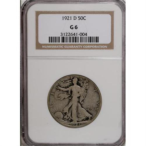 <B>1921-D 50C G6 NGC.</B></I> . NGC Census: (50/374). PCGS Population (88/640). Mintage: 208,000. Numismedia Wsl. Price for NGC/PCGS coin in G6 : $278. (#6584)<BR><BR><B>Coin Engraver:</B> Adolph A. Weinman<BR><BR><b>Shipping:</b> Coins & Currency (<a target="_blank" href="http://www.heritageauctions.com/common/shipping.php">view shipping information</a>)