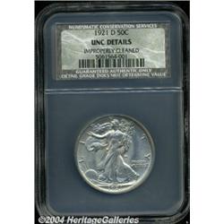 <B>1921-D<50C>--Improperly cleaned NCS.--Unc Details.</B></I> Extremely sharp with virtually complete head details and a full thumb. Very faint cleaning lines are visible on the surfaces, however, complete frosty luster is also visible. This lovely example has brilliant surfaces and exceptional eye appeal for the quality assignment. This is one of the so-called "big three" of early Walking Liberty half dollars, referring to the three 1921-dated issues.<BR><I>From The Barry Donnell Collection, Part Two.</B></I> <BR><BR><B>Important notice:</B> Heritage usually auctions material at the rate of 200-250 lots per hour. On some occasions eBay Live bid software or the Internet may not be able to keep up with the pace of the auction. We recommend placing a realistic absentee bid now as insurance to avoid disappointment. Occasionally the auctioneer may eliminate or reject an eBay Live bid, and the auctioneer may also reopen a lot after the close of the eBay live bidding (usually because we missed an audience bid), and may reject your bid even if it shows you as the winning bidder. By bidding via eBay Live, you agree that Heritage may award the lot to another bidder at its sole discretion under the circumstances described above or any other reasonable circumstances. Since eBay bids are not shown to us until we open the lot on the floor, we treat those bids just like floor bids. In most cases the floor responds before the eBay bid is presented to us, due to Internet lag time, so for consistency we have made it a policy that floor bids are always considered first over tie eBay live bids. Also please note that all Heritage lots purchased through eBay Live carry a 20% Buyer's Premium. Please make sure you read the Terms and Conditions before you bid. </span></font></tr></table></td></tr></table>