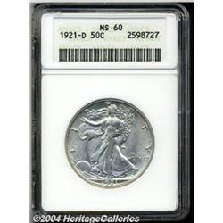 <B>1921-D<50C> MS60 ANACS.</B></I> With just 208,000 pieces produced, the 1921-D boasts the lowest mintage in the entire Walking Liberty Half Dollar series. This desirable Uncirculated representative is within reach of many more budgets than a higher grade piece. The untoned, satiny surfaces display average definition for the issue and, save for a trio of scrapes and milling marks in the right obverse field, are especially smooth for such a modest grade.<BR><I>From the Virgil Farstad Collection, Part Two.</B></I> <BR><BR><B>Important notice:</B> Heritage usually auctions material at the rate of 200-250 lots per hour. On some occasions eBay Live bid software or the Internet may not be able to keep up with the pace of the auction. We recommend placing a realistic absentee bid now as insurance to avoid disappointment. Occasionally the auctioneer may eliminate or reject an eBay Live bid, and the auctioneer may also reopen a lot after the close of the eBay live bidding (usually because we missed an audience bid), and may reject your bid even if it shows you as the winning bidder. By bidding via eBay Live, you agree that Heritage may award the lot to another bidder at its sole discretion under the circumstances described above or any other reasonable circumstances. Since eBay bids are not shown to us until we open the lot on the floor, we treat those bids just like floor bids. In most cases the floor responds before the eBay bid is presented to us, due to Internet lag time, so for consistency we have made it a policy that floor bids are always considered first over tie eBay live bids. Also please note that all Heritage lots purchased through eBay Live carry a 20% Buyer's Premium. Please make sure you read the Terms and Conditions before you bid.