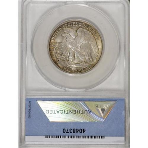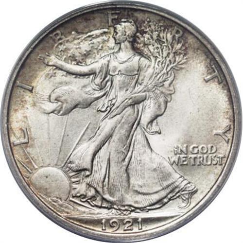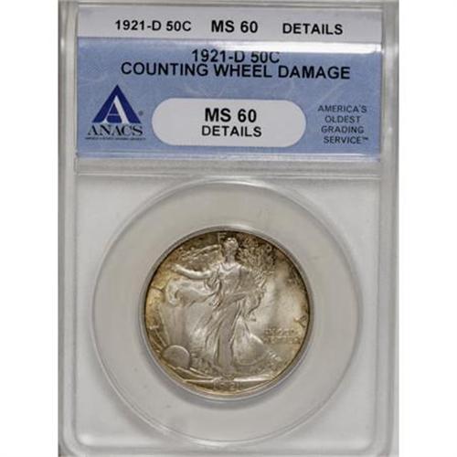 <B>1921-D 50C --Counting Wheel Damage--ANACS. MS60 Details.</B></I> This is a low-mintage key date in the popular Walking Liberty half dollar series. Well struck with lustrous surfaces that show pleasing golden-tan and russet peripheral patina on each side. A couple of faint pinscratches are noted in the right obverse field, and a minor abrasion is seen on Liberty's left (facing) leg, just behind the knee. We are unable to positively identify the counting wheel damage asserted by ANACS, and we recommend that prospective bidders examine the coin in person. <BR><BR><B>Coin Engraver:</B> Adolph A. Weinman<BR><BR><b>Shipping:</b> Coins & Currency (<a target="_blank" href="http://www.heritageauctions.com/common/shipping.php">view shipping information</a>)
