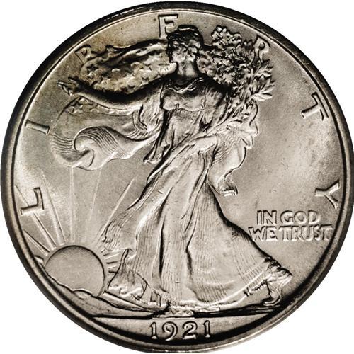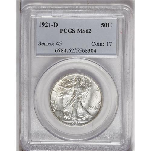 <B>1921-D<50C> MS62 PCGS.</B></I> All three of the Walking Liberty half dollar issues of 1921 are scarce dates. The 1921-D has the lowest mintage of them all, at 208,000 pieces (and the lowest mintage of the entire series). Somewhat surprisingly, the 1921-S is the scarcest of the three issues, even though its mintage of 548,000 coins is more than double that of either the '21 or the '21-D.<BR> This example is as well struck as any '21-D that we have seen in recent years. Liberty's head and hand are quite adequately defined, and only minimal weakness is noted on the upper skirt lines and on the eagle's right (facing) leg. Pleasing luster illuminates each side, and the only hints of color appear in a few faint splashes of golden-tan, near the borders. Surface marks are small and there are very few for the grade. A pleasing and highly desirable representative of this important key date.<BR><I>From The Big Tex Registry Set of Walking Liberty Halves.</B></I>