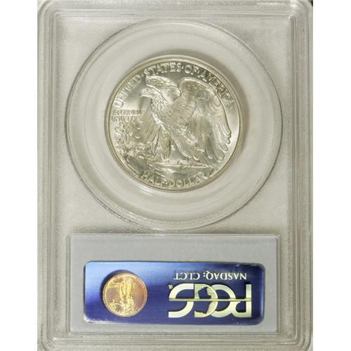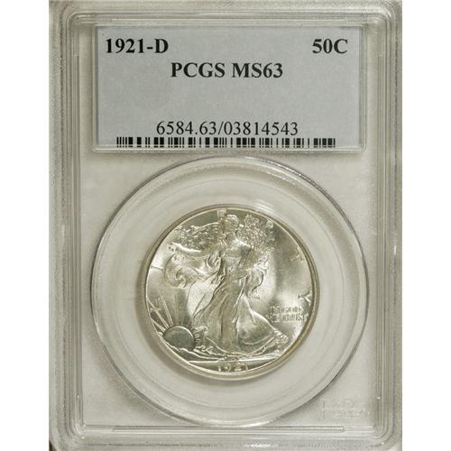 <B>1921-D 50C MS63 PCGS.</B></I> The 1921-D, with a production of 208,000 pieces, has the lowest mintage of the Walking Liberty half dollar series, and is an important key date. Bruce Fox, in his <I>The Complete Guide to Walking Liberty Half Dollars,</B></I> writes that "1921 was a recession year and there was a large reduction in business activity due to the end of the war. There was little need for small denomination coinage and the mints concentrated on silver dollars. Few halves were saved in mint state." The population figures seem to bear out this last point, as only 300 or so 1921-D Uncirculated coins have been certified by PCGS and NGC.<BR> Faint whispers of gold-tan color visit the reverse of the MS63 specimen in this lot, while the obverse is essentially untoned. Vibrant luster enlivens both sides, and the design elements are typically struck, with partial definition visible in the thumb on Liberty's left (right facing) hand. A few minuscule handling marks on each side define the grade. A pleasing coin for the grade designation.<BR><BR><b>Shipping:</b> Coins & Currency (<a target="_blank" href="http://www.heritageauctions.com/common/shipping.php">view shipping information</a>)
