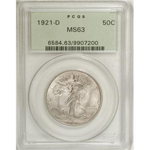 <B>1921-D 50C MS63 PCGS.</B></I> The 1921-D Walker is an important part of a complete set of these coins, and this piece is an attractive example that is housed in a PCGS green-label holder. Although a few light surface marks are present on each side, they are consistent with the grade. This piece is sharply struck with a fully visible thumb at the center of the obverse. The surfaces have bright silver luster with traces of heather toning.<BR> According to Mint records, the mintage was 208,000 coins. However, Walter Breen discussed additional records of the Denver Mint that indicate two die pairs were used to strike 165,000 coins from one, and 92,672 coins from the other. These figures imply that there were 49,672 of these coins that were never distributed, almost certainly later melted and recoined.<BR><BR><b>Shipping:</b> Coins & Currency (<a target="_blank" href="http://www.heritageauctions.com/common/shipping.php">view shipping information</a>)