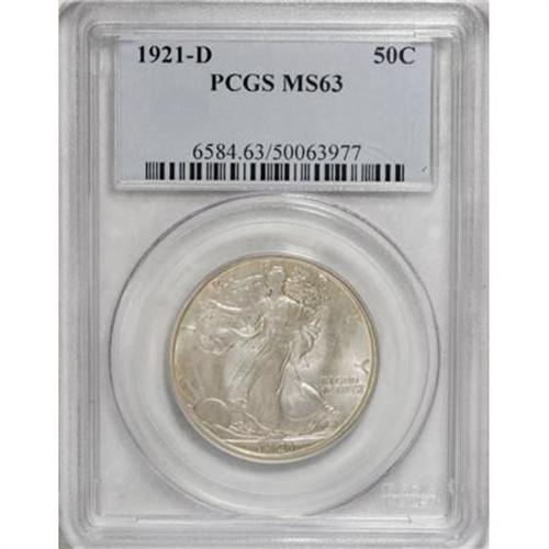<B>1921-D 50C MS63 PCGS.</B></I> The 1921-D is a key issue in the Walking Liberty series and is highly regarded among half dollar specialists. Only 208,000 pieces were minted, the lowest in the series. This was partly due to the large reduction in business activity resulting from the end of the war. <BR> This Select example is a well, but not fully struck piece that has attractive satiny luster. Each side has just a bit of light reddish-golden patina and there are no obvious marks. Some light roller marks are visible on both central devices. This is a well balanced piece for the advanced collector.<BR><BR><B>Coin Engraver:</B> Adolph A. Weinman<BR><BR><b>Shipping:</b> Coins & Currency (<a target="_blank" href="http://www.heritageauctions.com/common/shipping.php">view shipping information</a>\)