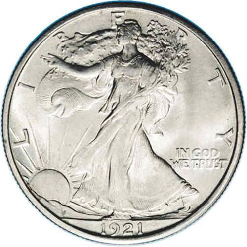 <B>1921-D<50C> MS64 NGC.</B></I> Creamy luster and light chestnut-gray color confirm the originality of this impressive key-date near-Gem. No marks merit discussion, and a few pinpoint flecks near the right reverse border are of no account. The strike is crisp, although not needle-sharp on the index finger of the branch hand and on the outline of Liberty's helmet near the cheek. The 1921-D has the lowest mintage of the entire series, and unlike the 1938-D, was not contemporaneously hoarded. Only the 1919-D and 1921-S are more coveted in Uncirculated grades.