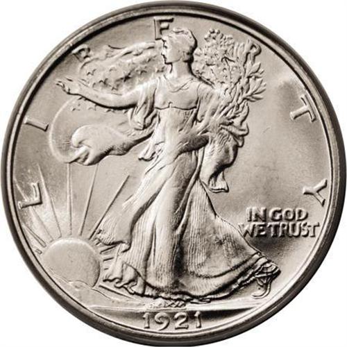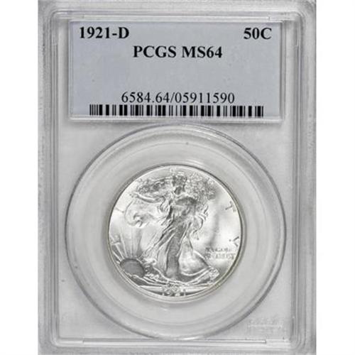 <B>1921-D 50C MS64 PCGS.</B></I> The 1921-D is one of the high visibility keys to the Walking Liberty series. One might suspect that from its mintage of 208,000 pieces, the lowest in the series. But additionally it is not an issue that was saved because of its low mintage, as the 1909-S VDB cent or 1916-D dime were, for instance. Part of the reason halves from this year are so scarce is because 1921 was a recession year. Even in good times, a half dollar represented a significant amount of money to set aside, but in a recession year it was just that much more improbable. <BR> The 1921-D is a difficult issue to locate in high grades, and "high grades" is defined as coins in VF and better condition. This piece displays bright, shimmering, satin-like mint luster and there are no mentionable abrasions on either side. The striking details are only slightly soft in the centers, the most notable softness limited to the trailing leg of the eagle.<BR><BR><B>Coin Engraver:</B> Adolph A. Weinman<BR><BR><b>Shipping:</b> Coins & Currency (<a target="_blank" href="http://www.heritageauctions.com/common/shipping.php">view shipping information</a>)